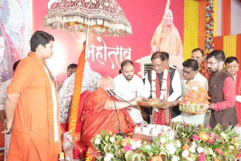 Korba.कोरबा के एकदिवसीय प्रवास पर आए मुख्यमंत्री विष्णु देव साय कोरबा नगरीय क्षेत्र स्थित भवानी मंदिर परिसर में आयोजित राम कथा महोत्सव में शामिल हुए। उन्होंने परिसर में राम कथा वाचन के लिए आए श्री श्री 1008 जगद्गुरू श्री रामभद्राचार्य के दर्शन कर उनका आशीर्वाद लिया एवं प्रदेश की सुख समृद्धि की कामना की। मुख्यमंत्री साय ने महोत्सव में आए श्रद्धालुओं को सम्बोधित करते हुए सभी को नवरात्रि एवं दशहरा पर्व की शुभकामनाएं दीं। उन्होंने कहा कि जगद्गुरु के कोरबा आगमन से ऊर्जाधानी की धरती धन्य हो गयी है। उनका आशीर्वाद प्रदेशवासियों पर सदैव बनी रहे।